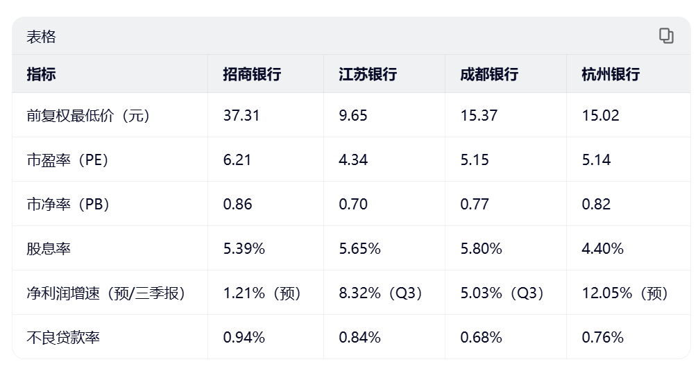 近一段时间银行板块受资金面影响调整幅度较大,市场情绪偏谨慎。此前我曾记录过一次加仓操作,近日银行股出现一定反弹,结合当前估值与基本面情况,本文将对部分持股银行——招商银行、江苏银行、成都银行、杭州银行——进行阶段性底部区域的探讨,为后续仓位管理提供参考依据。