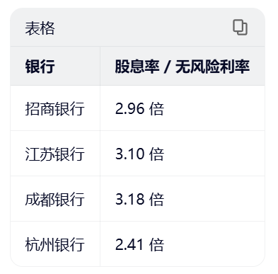 当前十年期国债收益率约为 1.82%,一年期存款利率在 0.95%-1.15% 区间。我们以十年期国债作为无风险利率基准,计算各银行股的股息率相对于无风险利率的倍数,结果如下: