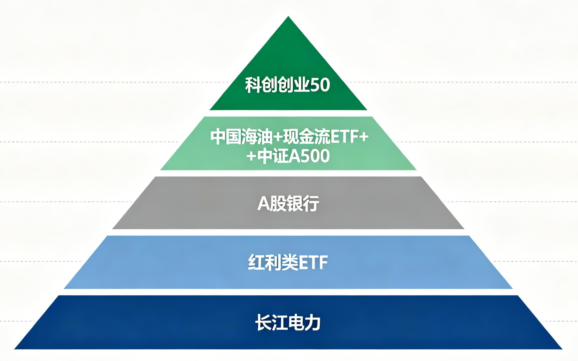先明确我的持仓标的:江苏银行、杭州银行、成都银行、招商银行(5家银行)、长江电力、中国海油、现金流ETF、红利类ETF,中证A500ETF,创业板50ETF。这一组合的本质是构建”防守打底、进攻补位”的均衡组合,兼顾现金流稳定和长期收益弹性,避免单一标的或行业的风险集中;