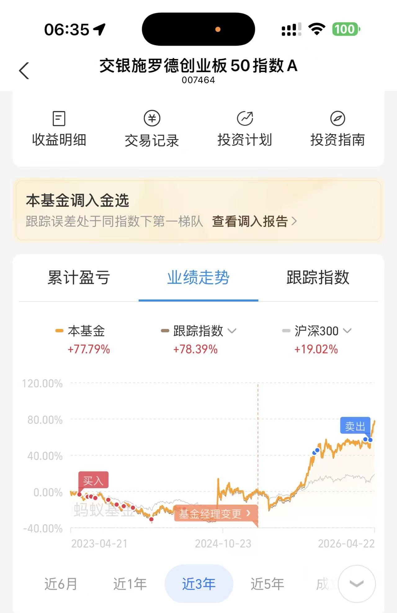 最近发现一件特别有意思的事情,我自己持仓持有的一只交银创业板 50 指数基金,在某基金销售平台,近期被官方标上了”金选基金”的优秀称号。
