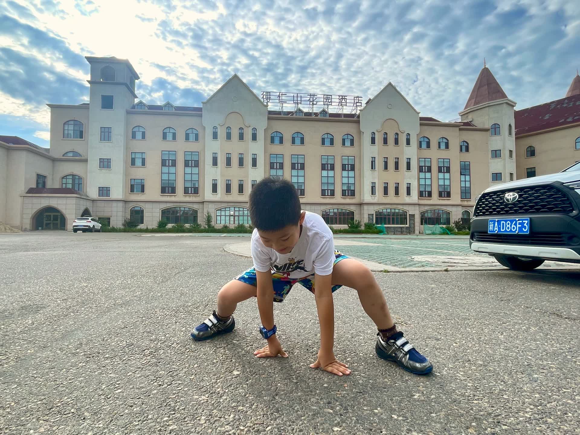 午后抵达北屯镇。入住的酒店造型别致,远观如一座荒原小城堡,停车场四周果树成荫,青果挂枝,不知名的花草开得热烈,给这座戈壁小镇添了几分温柔。