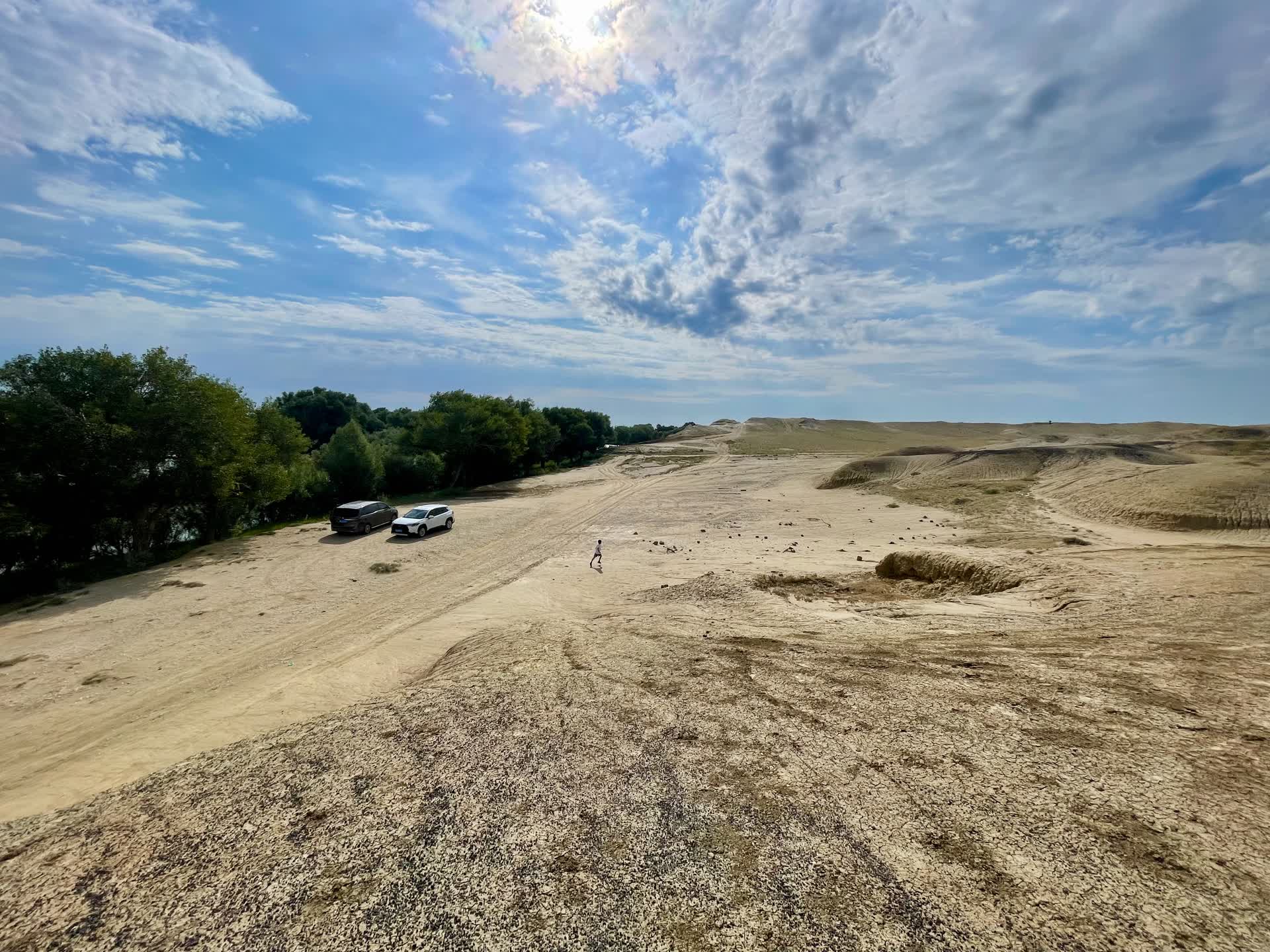 翌日,我们告别北屯,继续向喀纳斯进发。行至中途,我们在一处有河的山坡稍作停留。在水资源匮乏的北方,这样一条蜿蜒的河流显得尤为珍贵。孩子们的世界总是简单的,对于他们而言,风景的壮丽远不如沙丘上奔跑的乐趣来得真切。看着儿子和朋友的女儿在沙丘上欢快地探险,笑声在空旷的原野上回荡,那一刻,我忽然明白,旅行的意义对于孩子来说,或许就是这种无拘无束的体验,是与新朋友共同创造的快乐记忆。