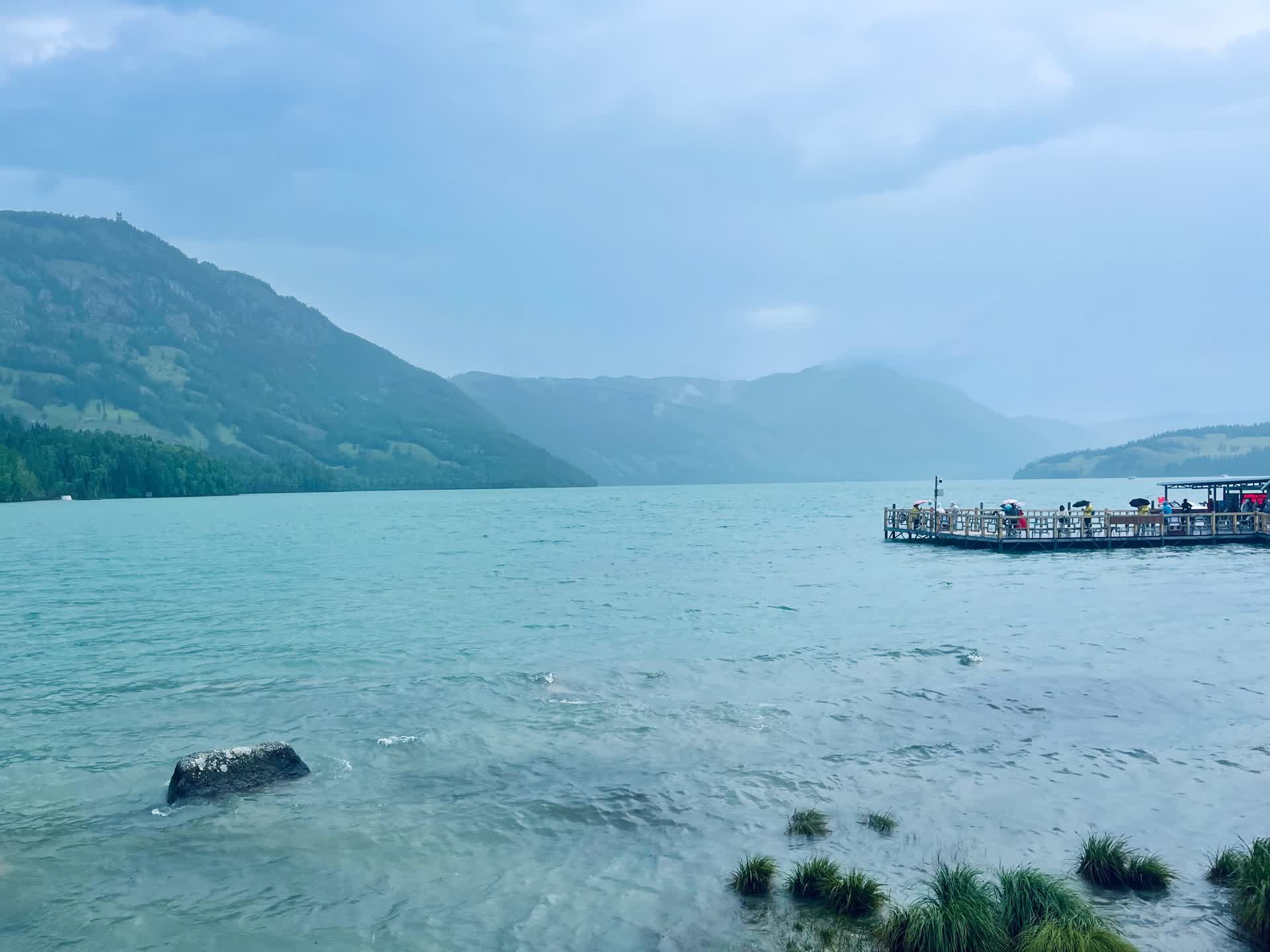 而另一重遗憾,关乎光影。喀纳斯湖水色变幻,素有“变色湖”之谜,唯有阳光倾洒时,湖水才如碧玉般清澈透亮,泛着摄人心魄的宝石光泽。而今日阴雨连绵,湖面被灰蒙蒙的雾气笼罩,远山隐没在云霭之中,云与雾不分彼此,却似“山色空蒙雨亦奇”的水墨意境。