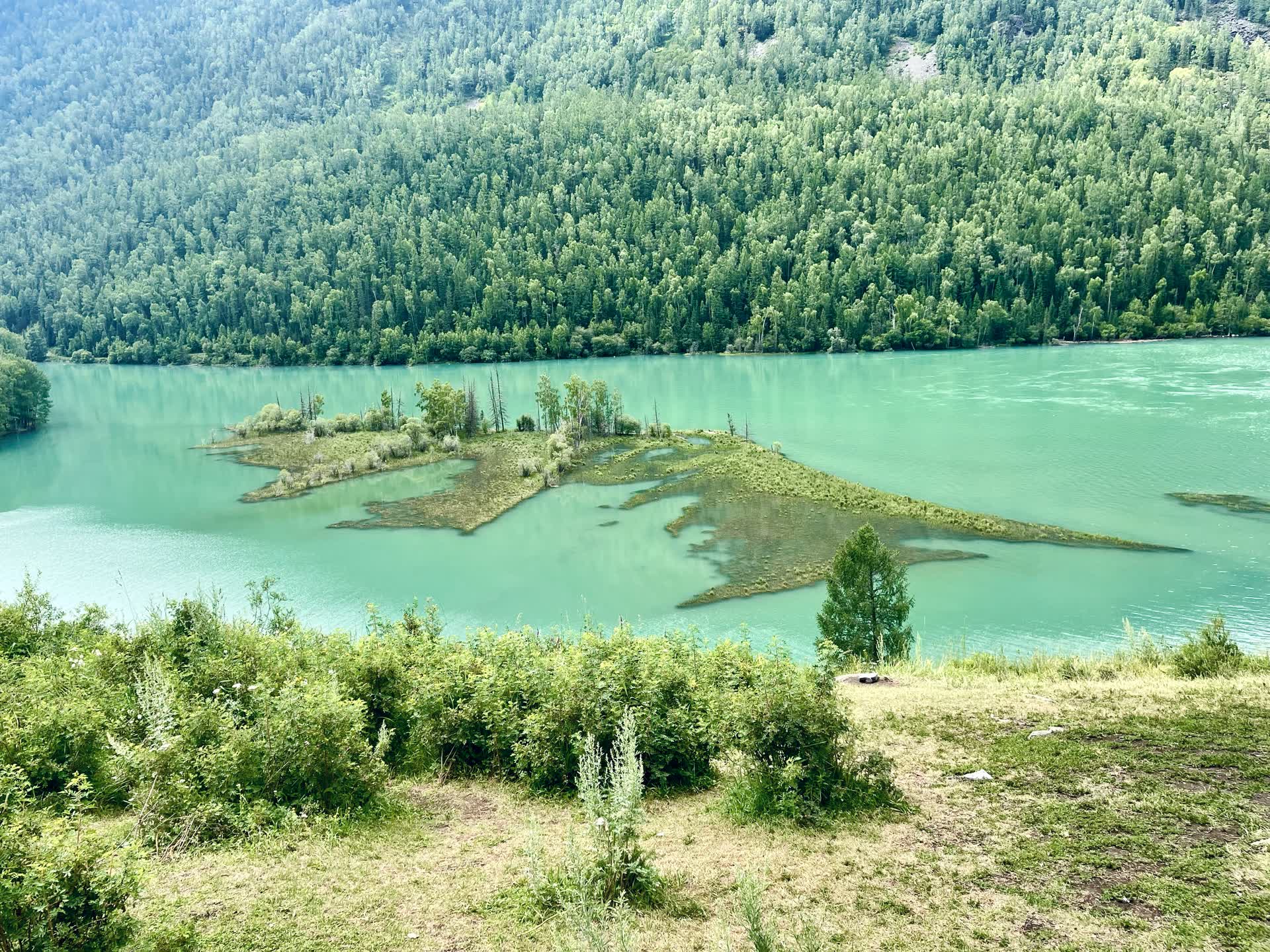 月亮湾处,喀纳斯河绕着山脚划出一道优美的弧线,宛如一弯新月嵌入谷底,碧波荡漾,两岸植被色彩斑斓。我们顺着沿河木栈道开始徒步。木栈道依山势河道而建,时而拾级而上,时而临水而行,穿梭在茂密的林间与丛生的杂草间。走在栈道上,脚下是湿润的木板,一侧是碧绿的 喀纳斯河,