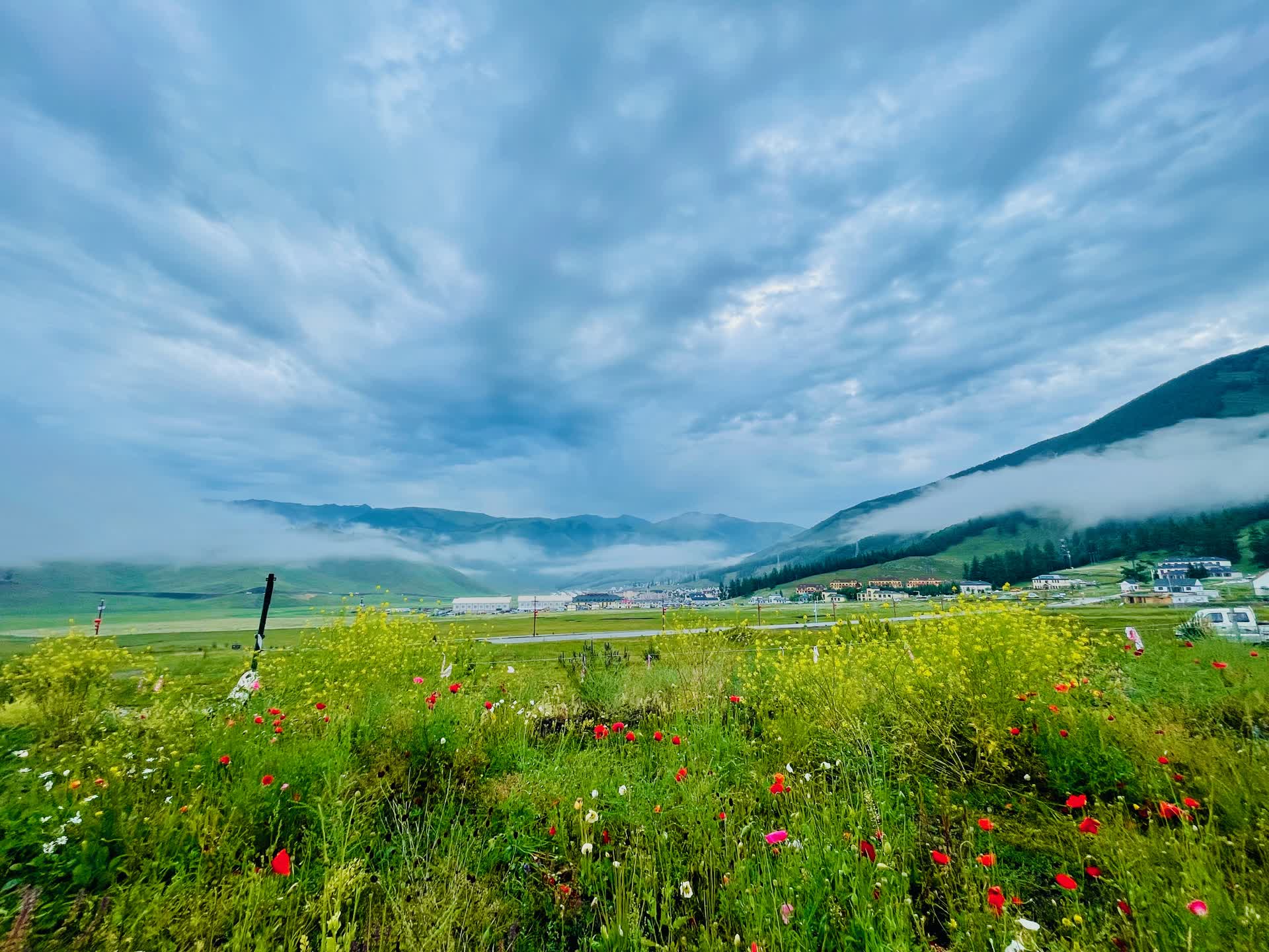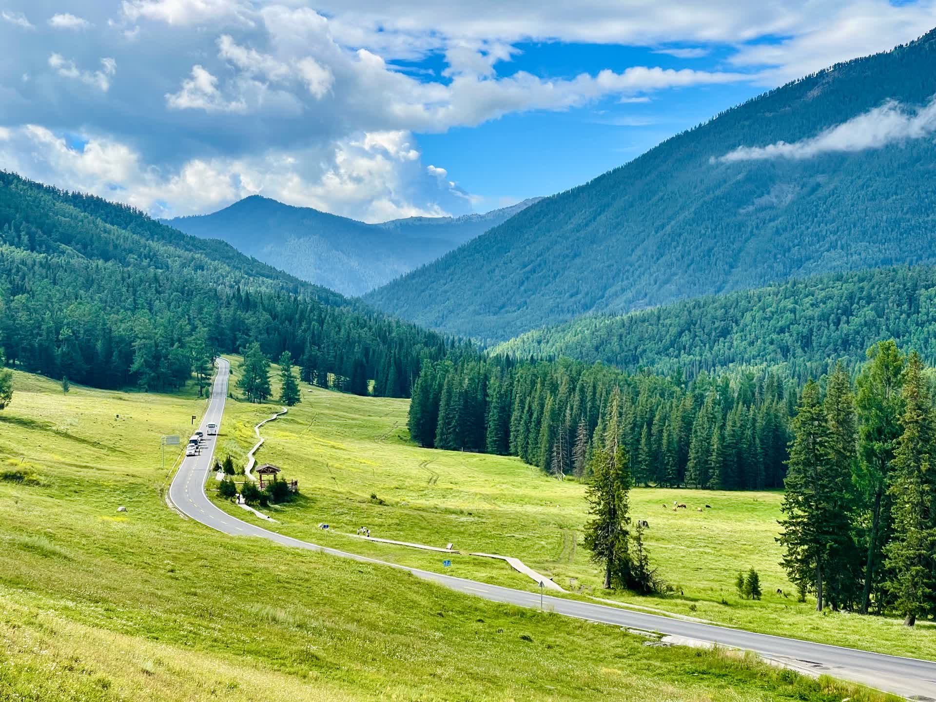 我们宿于贾登峪,暑期旺季的价格比淡季高出不少,可供选择的也不多。简单果腹后,便向着景区乘车点过去。虽是盛夏暑假,人流却未至拥挤,不算特别多。方才还是晴光潋滟,转瞬便有细雨斜织,云雾在山间流转,将天地晕染成一幅流动的水墨。乘景区大巴沿蜿蜒山路深入,车轮碾过林间公路,层层叠叠的泰加林在窗外倒退,将我们送入秘境深处。