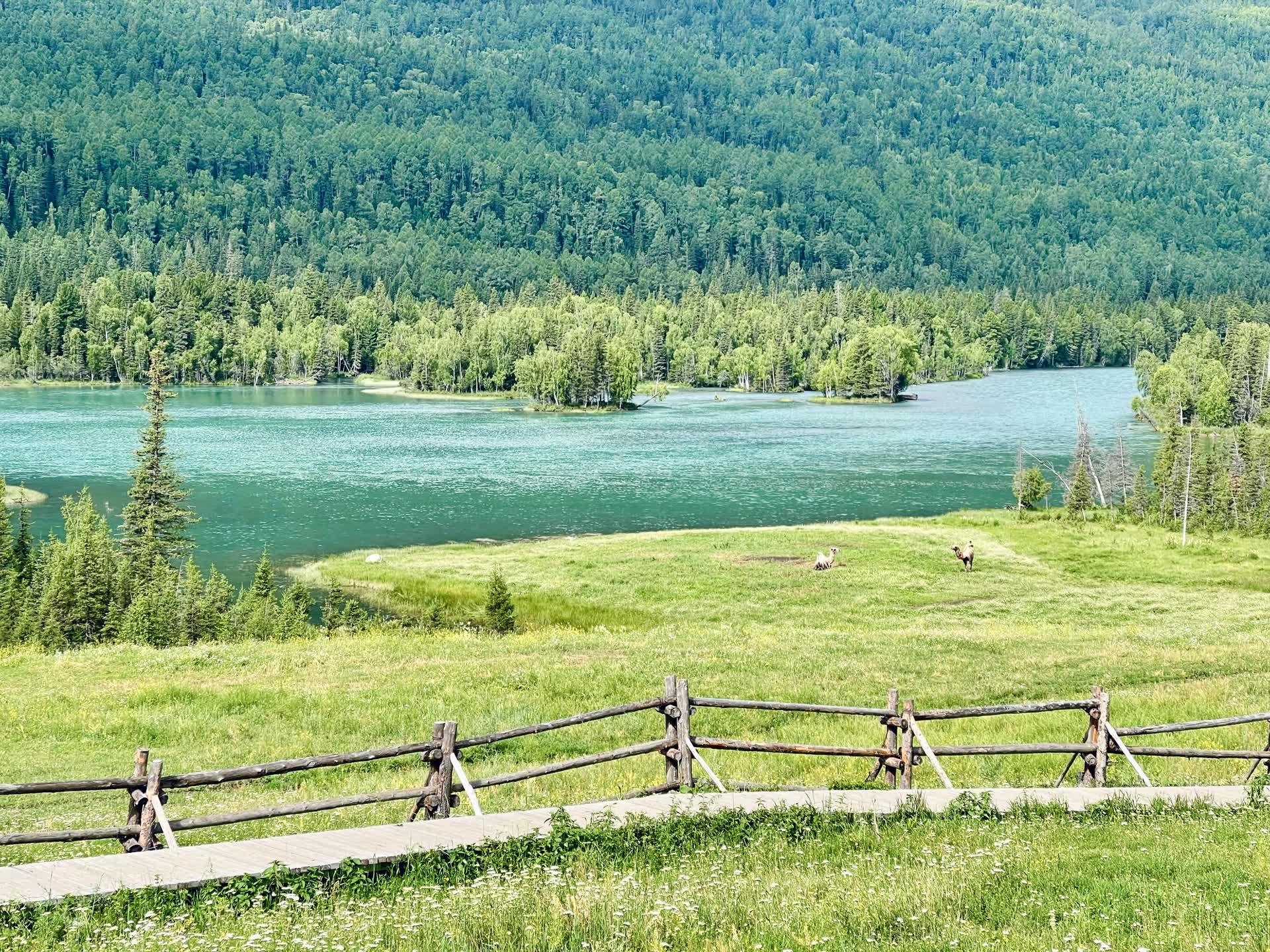 次日天公作美,晴光万里,我们乘车先至神仙湾,再至月亮湾后,徒步到卧龙湾。从喀纳斯湖倾泻而出的喀纳斯河,在雪山峡谷间蜿蜒穿行,流至神仙湾时,河谷豁然开朗,河面拓宽,水流渐缓,河畔草甸如茵,各色野花星点绽放,牛羊与骆驼悠然踱步,云雾常绕林间,不负 “神仙湾” 的美名。河水随光影变幻,时而碧绿如翡翠,时而湍急泛银波,一路奔涌,奔赴遥远的北冰洋。