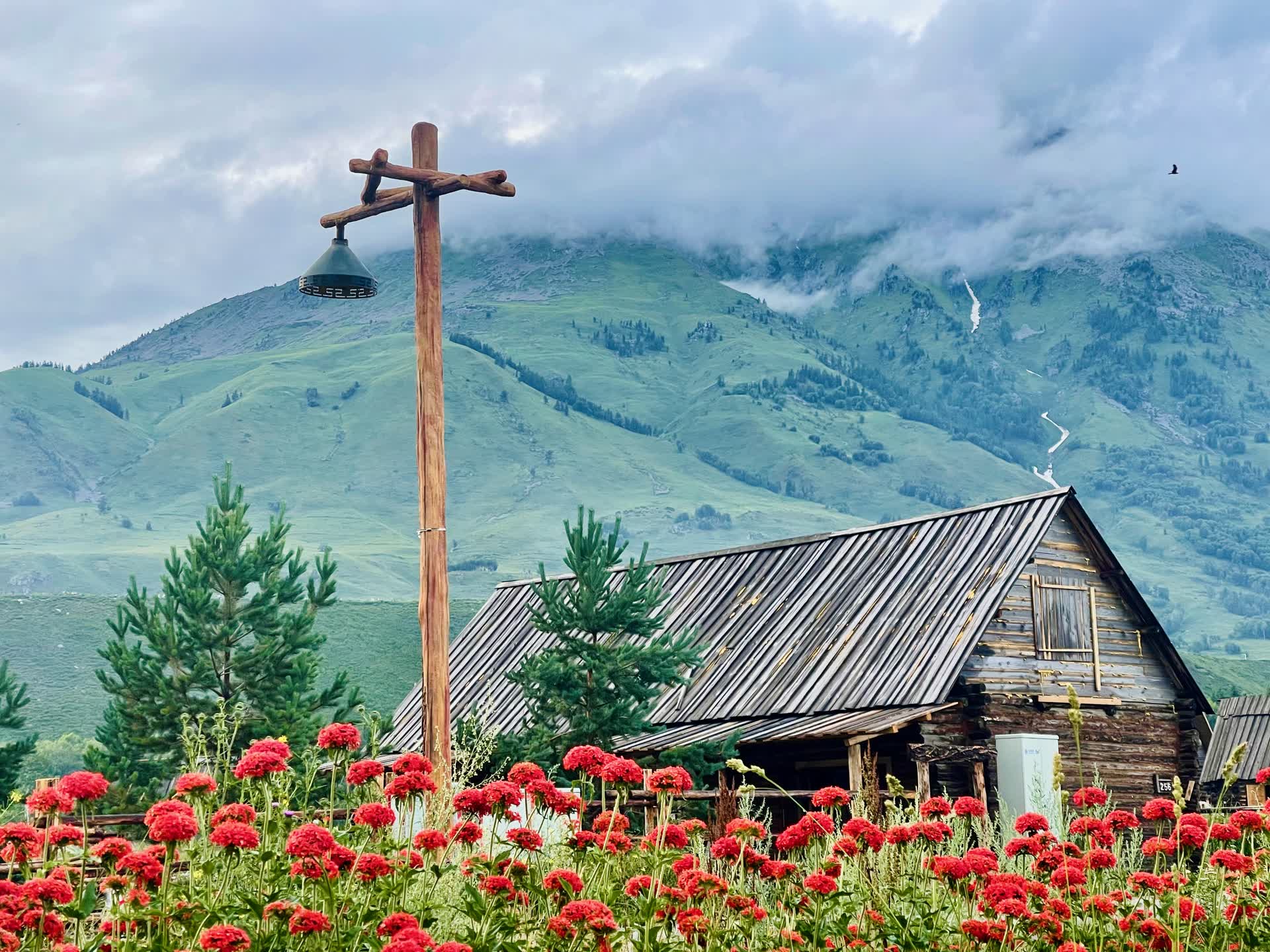 从喀纳斯的湖光山色里抽身,一路奔赴禾木,未曾想,一场不期而至的阵雨,成了这片土地赠予我们的第一份见面礼。山路中,雨势骤然汹涌,天地间仿佛被扯起一道密不透风的雨帘,远处的草原在雨幕中褪去了平日的明艳,化作一片氤氲的水墨,深浅交错,只剩模糊的轮廓;车轮前的土路被雨水浸透,泥泞不堪。我们在汽车站辗转换乘,雨水裹挟着山野的清冽,毫无章法地砸落,不过片刻,同行几人便尽数成了落汤鸡,衣衫紧贴肌肤,带着微凉的湿意,让这场旅途多了几分波折。