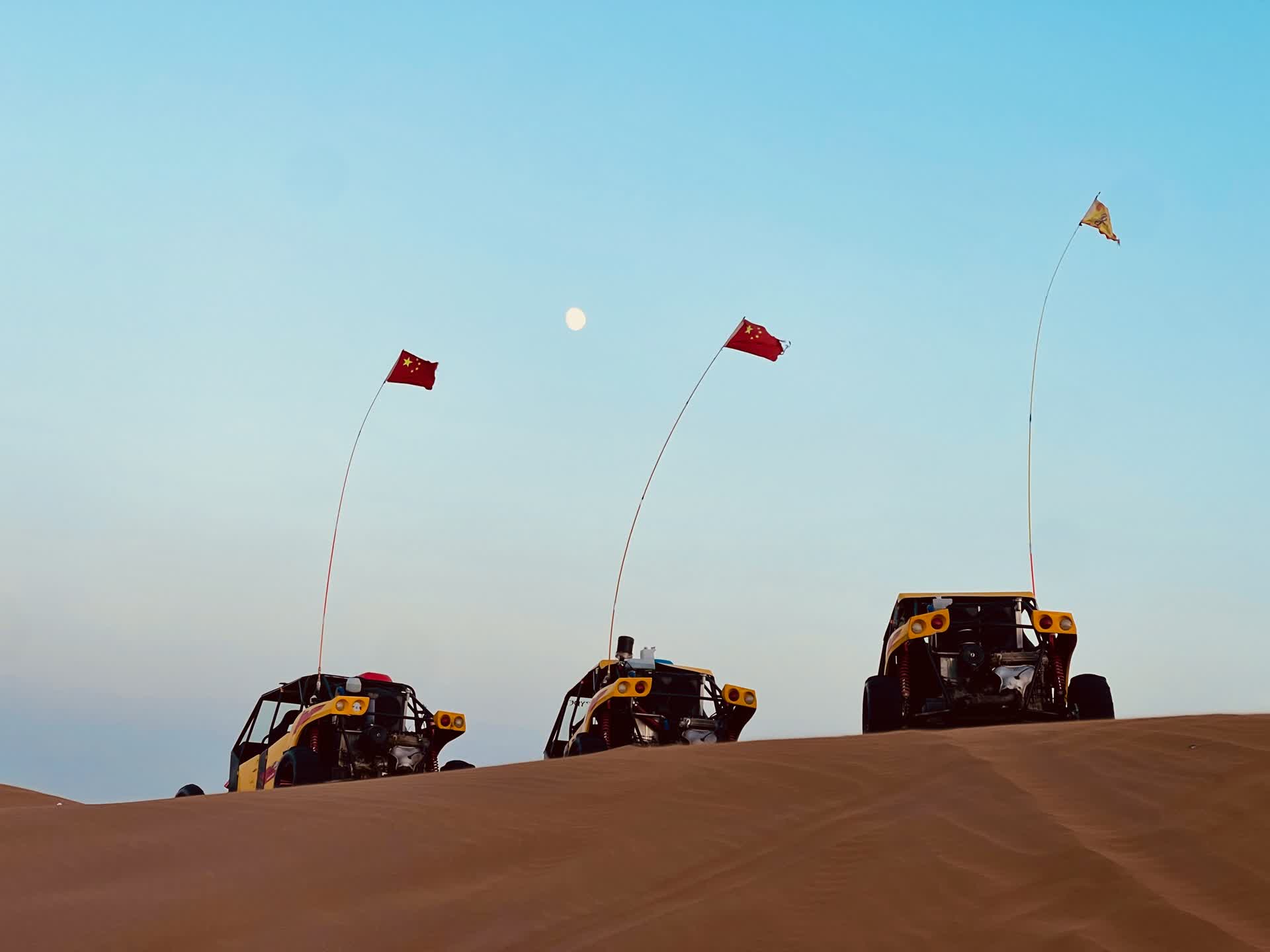 第一天傍晚,我们直奔库木塔格沙漠,最先体验的是沙漠冲锋车。改装后的四驱越野车没有封闭车厢,引擎轰鸣作响,刚坐稳,车子便如脱缰野马般冲向沙山。司机师傅技术娴熟,车子在陡峭的沙脊上俯冲、爬升、急转弯,时而冲上沙顶,时而坠入沙谷,失重感一波接一波袭来,车尾扬起漫天黄沙,打在脸上微微发疼,全程刺激又畅快。