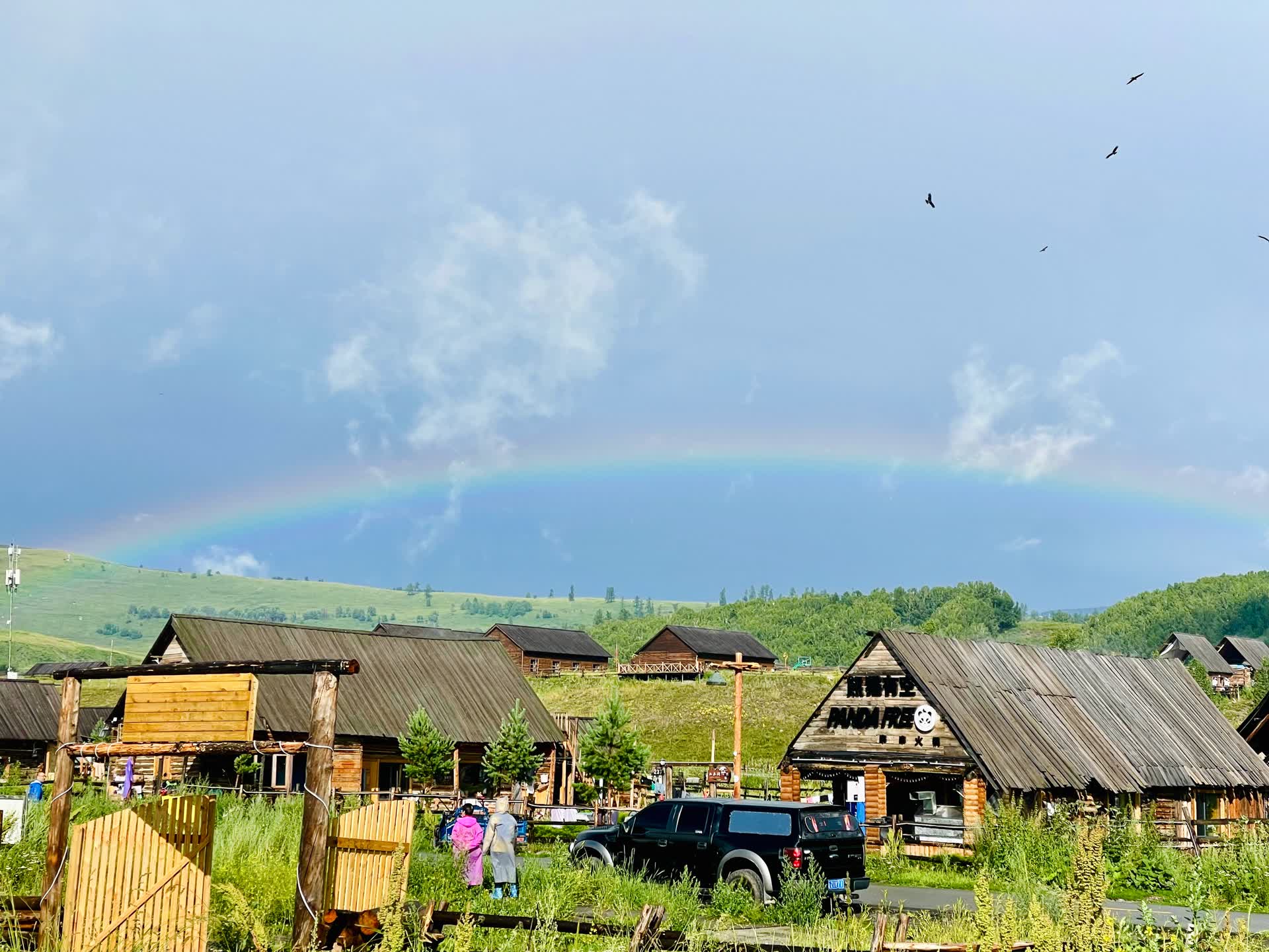 所幸,旅途从不会吝啬惊喜。当巴士缓缓行至民宿附近,天上的乌云竟被太阳赶走,风雨暂歇,阳光温柔地铺洒下来。抬眼望去,一道彩虹横跨天际,一端隐入青山,一端垂落村落,将雨后的禾木勾勒得如梦似幻,所有的狼狈与仓促,都在这一刻被温柔抚平。