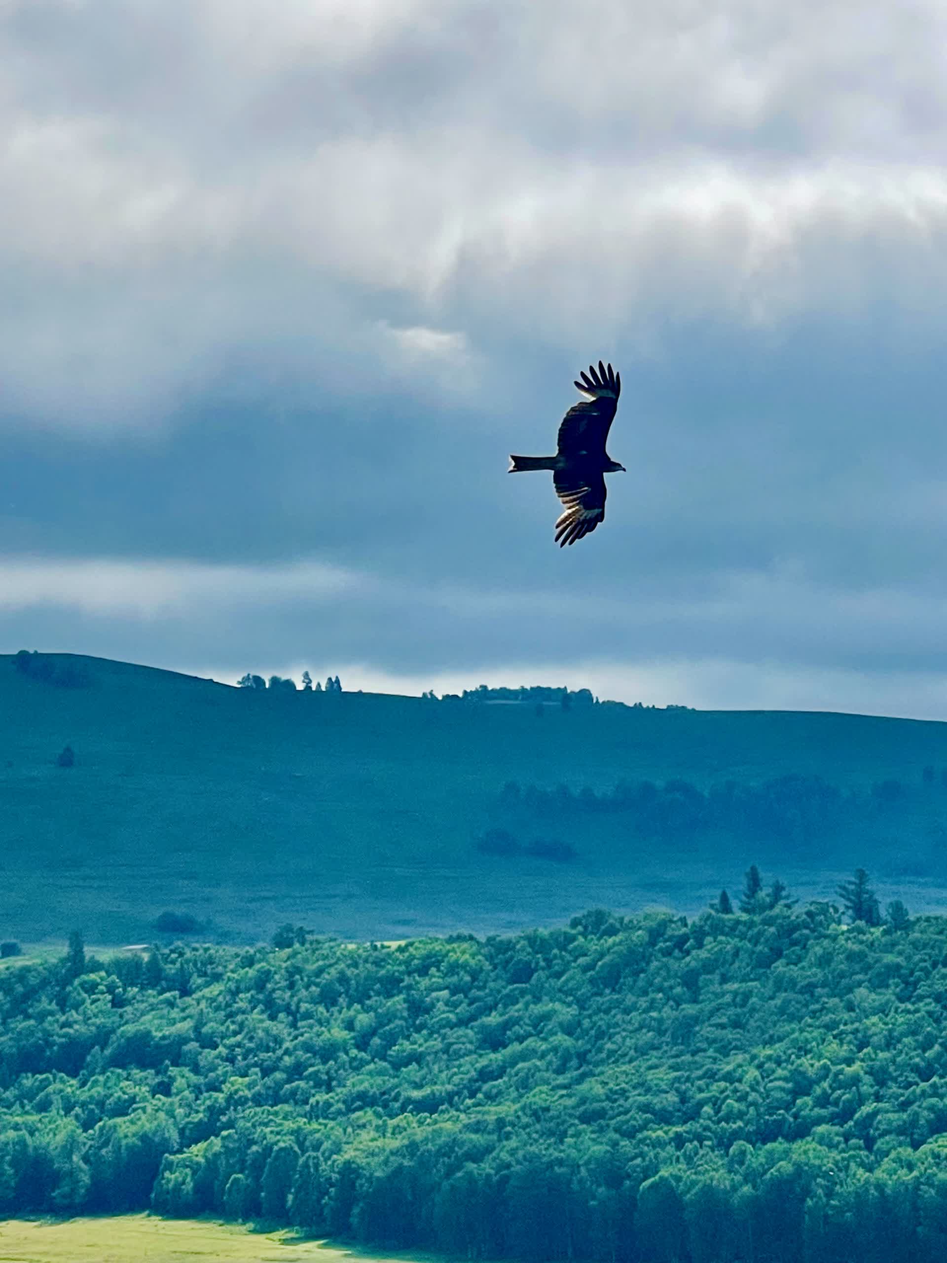 此时的天空澄澈如洗,大朵大朵的白云低低地悬浮着,仿佛伸手便可触碰,似是要落在地面,与青山、木屋相拥。几只雄鹰在天际盘旋,羽翼舒展,姿态矫健,时而俯冲,时而翱翔,划破宁静的天空,为这片草原增添了几分苍劲的辽阔。站在木屋前仰望,鹰鸣与风声交织,草原的辽阔与苍茫,便这般真切地撞入心怀,让人不由得心生敬畏。