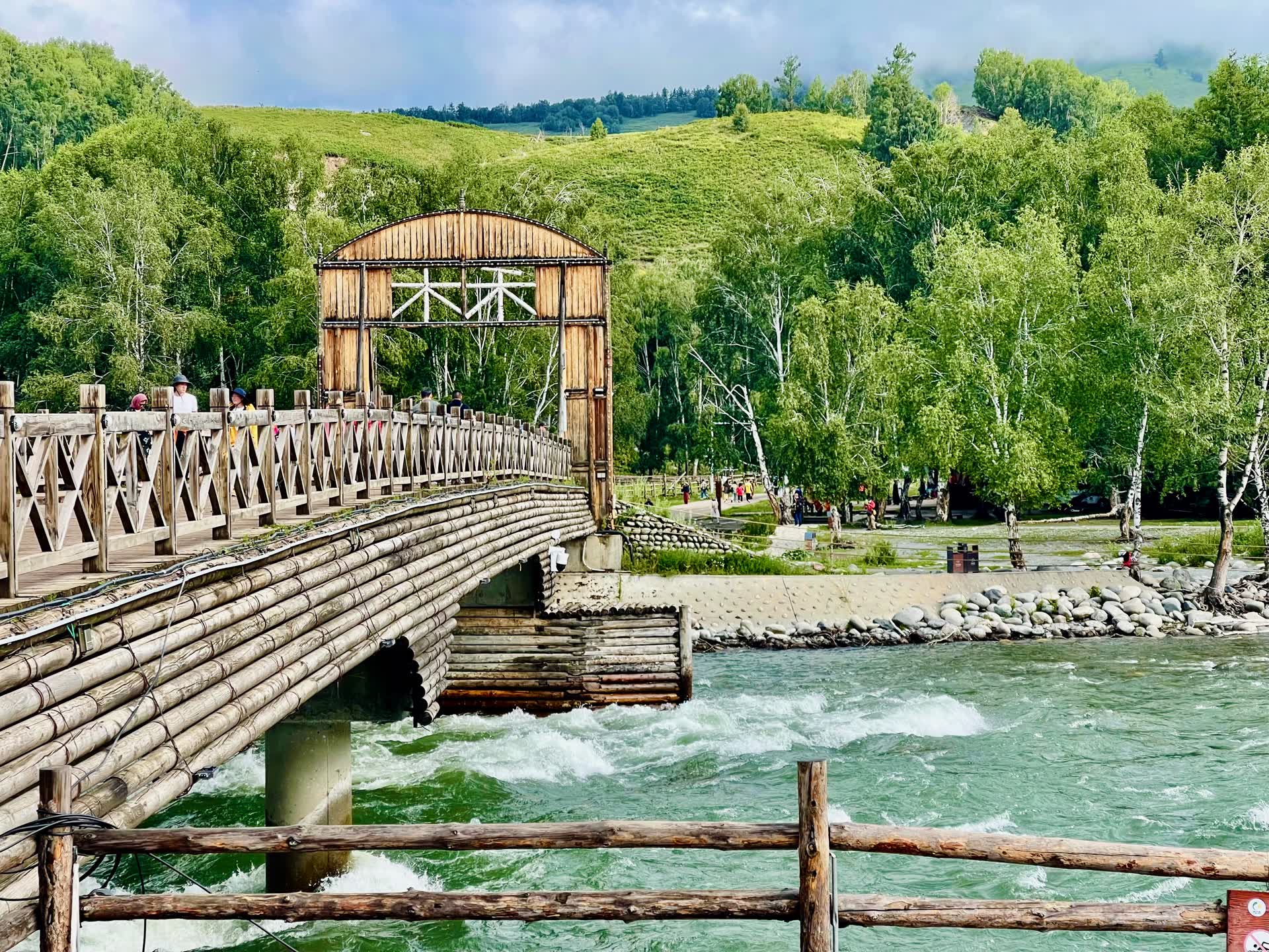 饱餐过后,我们循着村落的脉络前行,行至村口,便遇见了横穿禾木的那条河。河水奔腾汹涌,自深山处奔涌而来,浪涛拍打着河岸,发出震耳的轰鸣。这便是禾木河,它发源于阿尔泰山的友谊峰冰川,融雪汇聚成溪,一路蜿蜒穿行,淌过草原、漫过林地,最终汇入额尔齐斯河,成为北疆水系中不可或缺的一脉。河面上架着一座古朴的木桥,承载着无数往来旅人与当地村民的脚步。
