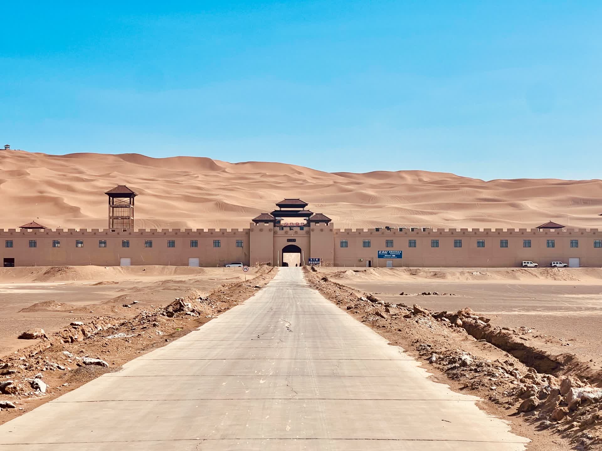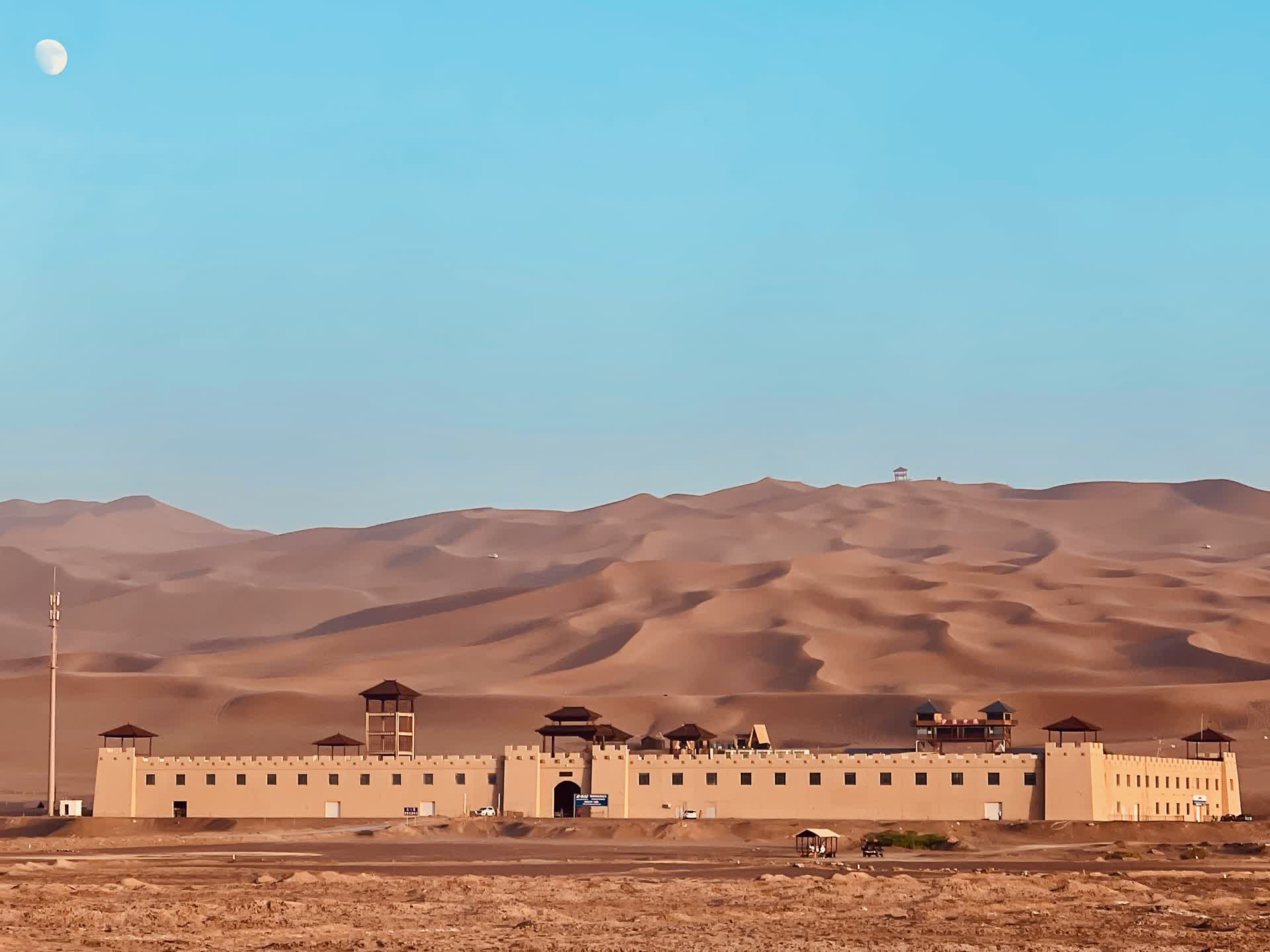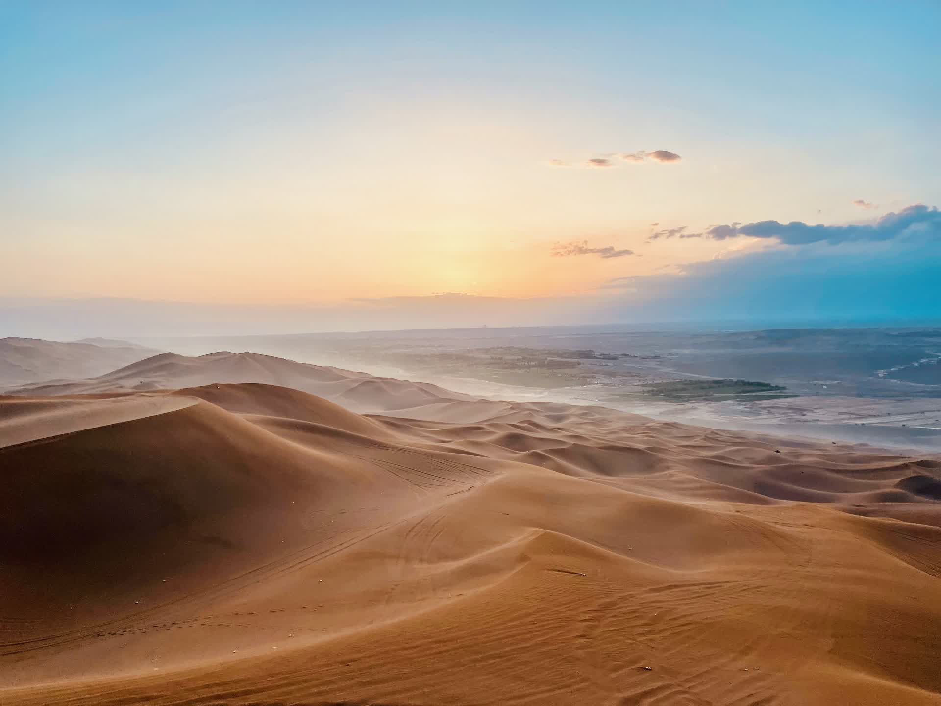 冲沙结束,恰逢夕阳西下。此时的沙海褪去白日的燥热,风卷着细沙贴着沙丘表面流动,像一层朦胧的纱。橙红的落日悬在天际线,将连绵沙海染成暖金色,远处的天空晕开粉紫、橘红的晚霞,朦胧又壮阔。天地间只剩沙沙的风声与缓缓沉落的落日,所有的喧嚣都被抚平,只剩大漠独有的安静与震撼。